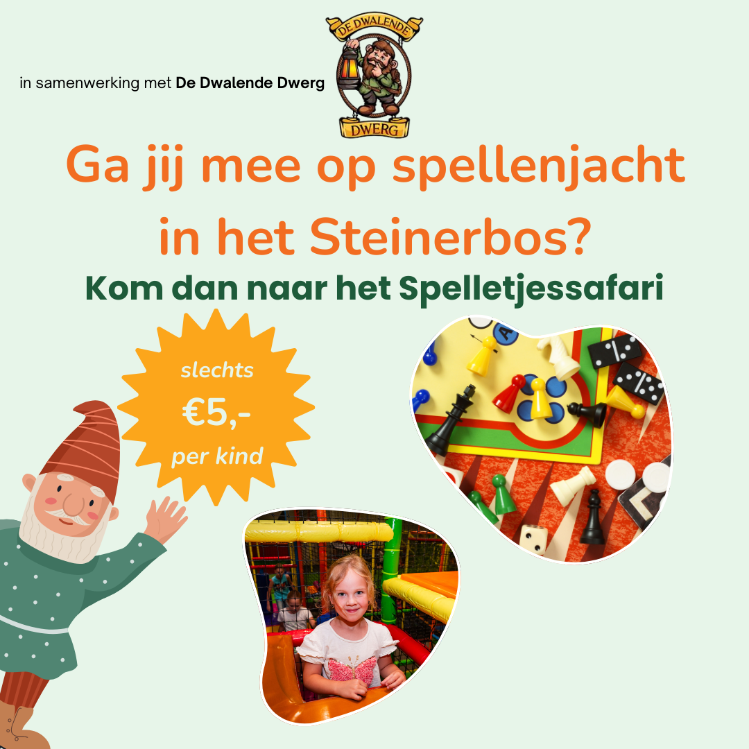 Steinerbos organiseert op woensdag 15 oktober, in samenwerking met De Dwalende Dwerg, de eerste editie van de Spelletjessafari. Kinderen van 8 t/m 13 jaar ontdekken in de binnenspeeltuin een afwisselend aanbod van eenvoudig te leren spellen en uitdagende familiespellen.